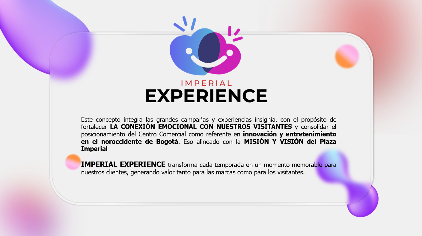 Plaza Imperial Centro Comercial, con 20 años de trayectoria en el sector, se encuentra ubicado en la ciudad de Bogotá, es el centro comercial de mayor área en la localidad de Suba, ofreciendo servicios y productos de comercio, gastronomía y eduentretenimiento con altos estándares de calidad. Cuenta con 240 marcas, seis salas de cine, marcas ancla y semi ancla, entre las que se destacan Jumbo, Falabella, Homecenter, Cinemark, Playland, Bodytech, Smart Fit y Arturo Calle. se destaca por su sólida gestión humana, promoviendo programas de bienestar para colaboradores y sus familias, orientados a fortalecer el compromiso organizacional y entornos de estabilidad, confianza y satisfacción laboral. |